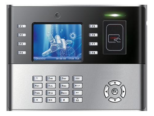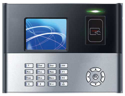 A fully loaded Proximity card based attendance terminal. Wifi, GPRS, Mifare card features available on request. Elegant exterior, color display, 30000 Cards, 100000 Transaction Logs capacity.